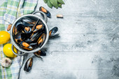 Świeże owoce morza, małże z cytryną klinów. Na tle drewnianych.
