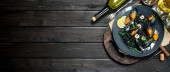 Dania kuchni śródziemnomorskiej. Spaghetti z owocami morza z małżami i białego wina. Na czarnym tle rustykalnym.