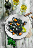 Dania kuchni śródziemnomorskiej. Spaghetti z owocami morza z małżami i białego wina. Na tle drewnianych.