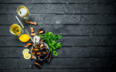 Dania kuchni śródziemnomorskiej. Spaghetti z atramentem mątwy, małże i białego wina. Na tle drewnianych.