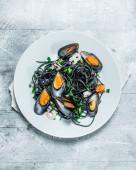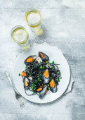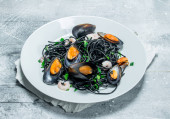 Makarony Śródziemnego. Spaghetti z atramentem mątwy i małże. Na tle rustykalnym.