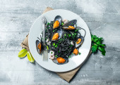 Makarony Śródziemnego. Spaghetti z atramentem mątwy, małże i białego wina. Na tle rustykalnym.