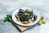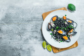 Makarony Śródziemnego. Spaghetti z atramentem mątwy, małże i białego wina. Na tle rustykalnym.