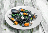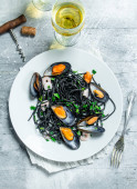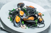 Makarony Śródziemnego. Spaghetti z atramentem mątwy i małże. Na tle rustykalnym.