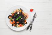 Makarony Śródziemnego. Spaghetti z atramentem mątwy i małże. Na tle rustykalnym.