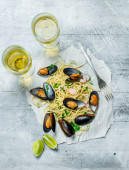Makarony Śródziemnego. Spaghetti owoców morza, małże i białego wina. Na tle rustykalnym.