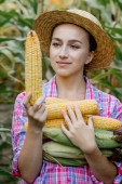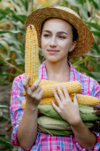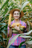 średni wiek brunetka biały kobieta gospodarstwo pracownik w okulary inspekcja kukurydza kolby w pole słoneczny letni dzień