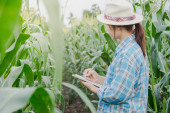 Średniowieczny brunetka biały kobieta gospodarstwo pracownik w okulary z cyfrowy tabletka inspekcja kukurydza pole słoneczny letni dzień