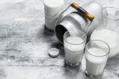 Zdjęcie "Mleko w okularach z puszki. Na tle rustykalnym ." może być wykorzystywane do celów osobistych i komercyjnych zgodnie z warunkami zakupionej licencji Royalty-free. Obraz jest dostępny do pobrania w jakości wysokiej rozdzielczości do 5760x3840.