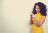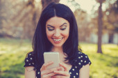 młoda kobieta w niebieska koszula gospodarstwa za pomocą smartfonu