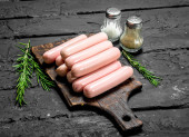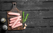 Kiełbasy gotowane z rozmarynem. Na czarnym tle rustykalnym.