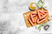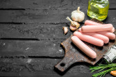 Kiełbasy gotowane z solą i pieprzem. Na czarnym tle rustykalnym