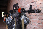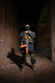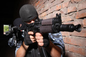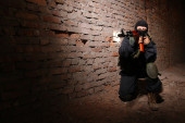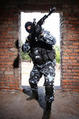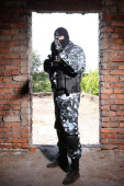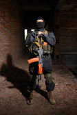 zbrojnych żołnierz w czarna maska kierowania z pistoletu