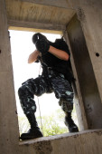 zbrojnych żołnierz w czarna maska kierowania z pistoletu
