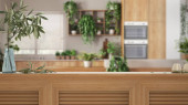 Drewniany klasyczny blat lub półka ze świecami i kamyczkami, nastrój zen, nad nowoczesną jadalnią ze stołem i kuchnią, wystrój wnętrz, koncepcja dżungli miejskiej