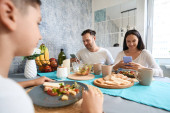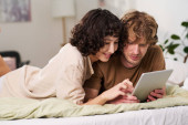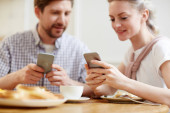 Zdjęcie "Szczęśliwa młoda kobieta ze smartfonem jedząca płatki kukurydziane z mlekiem siedząc przy kuchennym stole obok męża tworzącego sieć przed laptopem" może być wykorzystywane do celów osobistych i komercyjnych zgodnie z warunkami zakupionej licencji Royalty-free. Obraz jest dostępny do pobrania w jakości wysokiej rozdzielczości do 5760x3840.