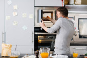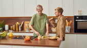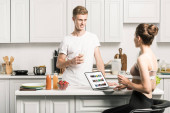 Młoda kobieta trzyma słoik płatków kukurydzianych stojąc przy zlewie i jej mąż ze smartfonem przewijającym kontakty lub rzeczy online