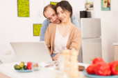 Zdjęcie "Szczęśliwa młoda kobieta obejmująca męża podczas oglądania ekranu laptopa podczas komunikacji w wideo czacie po śniadaniu" może być wykorzystywane do celów osobistych i komercyjnych zgodnie z warunkami zakupionej licencji Royalty-free. Obraz jest dostępny do pobrania w jakości wysokiej rozdzielczości do 5760x3840.