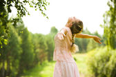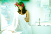 Młoda piękna albinos kobieta ze złotą spinką do włosów w długich blond włosach trzyma oczy zamknięte, stojąc pod marmurową ścianą
