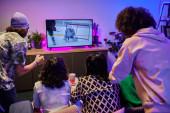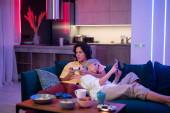 Zdjęcie "Młodzieńczy chłopcy i dziewczyna w casualwear oglądanie online wideo w mobilny gadżet podczas relaksu na kanapie wśród swoich przyjaciół w domu party" może być wykorzystywane do celów osobistych i komercyjnych zgodnie z warunkami zakupionej licencji Royalty-free. Obraz jest dostępny do pobrania w jakości wysokiej rozdzielczości do 5760x3840.