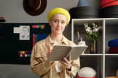 Zdjęcie "Młoda rzemieślniczka parująca nowy ręcznie robiony kapelusz nad patelnią z wrzącą wodą stojąc przy pracy przed kamerą" może być wykorzystywane do celów osobistych i komercyjnych zgodnie z warunkami zakupionej licencji Royalty-free. Obraz jest dostępny do pobrania w jakości wysokiej rozdzielczości do 5760x3840.