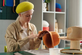 Młoda rzemieślniczka parująca nowy ręcznie robiony kapelusz nad patelnią z wrzącą wodą stojąc przy pracy przed kamerą