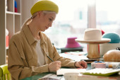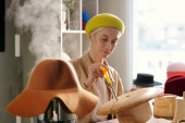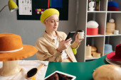 Zdjęcie "Młoda uśmiechnięta stylistka lub projektantka mody korzystająca z telefonu komórkowego podczas komunikacji w czacie wideo w miejscu pracy podczas przerwy" może być wykorzystywane do celów osobistych i komercyjnych zgodnie z warunkami zakupionej licencji Royalty-free. Obraz jest dostępny do pobrania w jakości wysokiej rozdzielczości do 5760x3840.