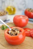 Zdjęcie "Pyszne pomidory z mieloną wołowiną, bulgurem i grzybami w szklanym naczyniu do pieczenia na białym stole. Miejsce na tekst" może być wykorzystywane do celów osobistych i komercyjnych zgodnie z warunkami zakupionej licencji Royalty-free. Obraz jest dostępny do pobrania w jakości wysokiej rozdzielczości do 5760x3840.