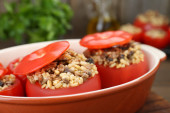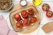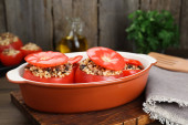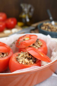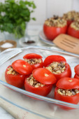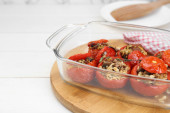 Pyszne pomidory z mieloną wołowiną, bulgurem i grzybami w szklanym naczyniu do pieczenia na białym stole. Miejsce na tekst