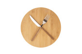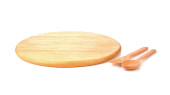 Koło taca z drewna łyżka i widelec izolowane na białym tle