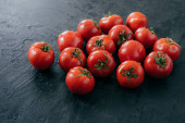 Ekologiczne warzywa i koncepcja zdrowego odżywiania. Zbierane czerwone pomidory z kropli wody, czarne tło. Zbliżenie tekstury. Rynek na otwartym powietrzu