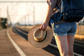 Kobieta turystka z plecakiem patrząca na pociąg na dworcu kolejowym. Kobieta podróżująca samotnie na wakacje
