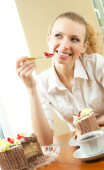 wesoły kobieta jedzenie tortu, na białym tle nad białym
