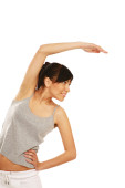 portret młodego szczęśliwy uśmiechający się włos, robienie ćwiczeń fitness, na białym tle nad białym