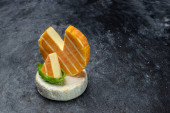 marinated tofu with herbs and spices. vegetarian tofu cubes on a dark background. banner, menu, recipe place for text, top view.
