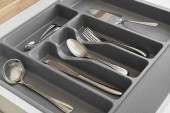 Szuflada otwarta kuchnia z różnymi sztućcami srebra, zbliżenie
