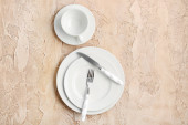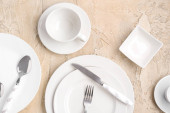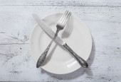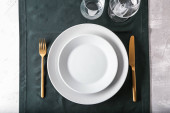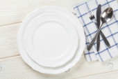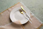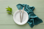 Srebrny nóż z widelcem, talerzem i ręcznikiem kuchennym na zielonym drewnianym tle