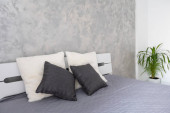 Stylowe wnętrze sypialni z wygodnym łóżkiem i pięknymi roślinami