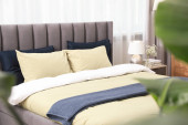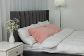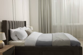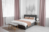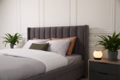 Zdjęcie "Stylowe wnętrze sypialni z wygodnym łóżkiem i pięknymi roślinami" może być wykorzystywane do celów osobistych i komercyjnych zgodnie z warunkami zakupionej licencji Royalty-free. Obraz jest dostępny do pobrania w jakości wysokiej rozdzielczości do 5760x3840.