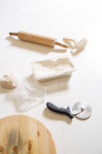 Closeup hand of chef baker in uniform blue apron cutting pizza at kitchen. High quality photo