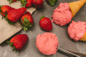Lody rabarbarowe i truskawkowe, domowej roboty gelato sorbetowe, mrożony deser owocowy ze świeżym rabarem i plastrami truskawek, na białym stole kuchennym przestrzeń do kopiowania