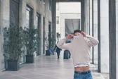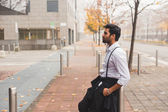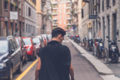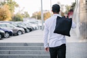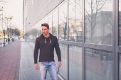 Widok z tyłu młodego człowieka, pozowanie na ulicach miasta