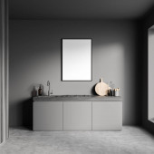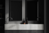 Zdjęcie "Ciemne wnętrze łazienki z podwójnym zlewem i kosmetykami, dwa wysokie lustra i drewniany kredens z akcesoriami kąpielowymi. Nowoczesny domowy pokój kąpielowy. Renderowanie 3D" może być wykorzystywane do celów osobistych i komercyjnych zgodnie z warunkami zakupionej licencji Royalty-free. Obraz jest dostępny do pobrania w jakości wysokiej rozdzielczości do 5760x3840.