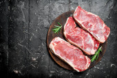 Surowe mięso. Wołowina i wieprzowina steki na pokładzie. Na tle drewnianych.