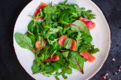 talerz sałatki pomidor, rukola, tarty ser, oliwa z oliwek zdrowy posiłek jedzenie przekąska na stole kopia przestrzeń żywności tło rustykalny widok górny keto lub paleo dieta wegetariańska wegańskie lub wegetariańskie jedzenie nie posiłek