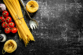 Zdjęcie "Surowe spaghetti na czarnym kamiennym pokładzie z pomidorami, czosnkiem, grzybami i olejem. Na czarnym tle rustykalnym" może być wykorzystywane do celów osobistych i komercyjnych zgodnie z warunkami zakupionej licencji Royalty-free. Obraz jest dostępny do pobrania w jakości wysokiej rozdzielczości do 5760x3840.
