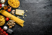 Surowe spaghetti na czarnym kamiennym pokładzie z pomidorami, czosnkiem, grzybami i olejem. Na czarnym tle rustykalnym