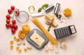 Zdjęcie "Surowy domowy makaron z różnymi sosami i Parmeonem. Na czarnym tle rustykalnym" może być wykorzystywane do celów osobistych i komercyjnych zgodnie z warunkami zakupionej licencji Royalty-free. Obraz jest dostępny do pobrania w jakości wysokiej rozdzielczości do 5760x3840.