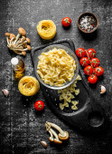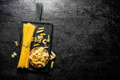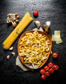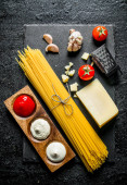 Surowy domowy makaron z różnymi sosami i Parmeonem. Na czarnym tle rustykalnym
