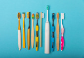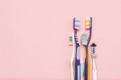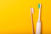 elektryczna szczoteczka do zębów, bambus i ręcznie robione szczoteczki do zębów na różowym tle z przestrzenią do kopiowania. Leżeć płasko. Higiena jamy ustnej. Zestaw pielęgnacyjny. Koncepcja dentysty. Miejsce na tekst. Miejsce do skopiowania.